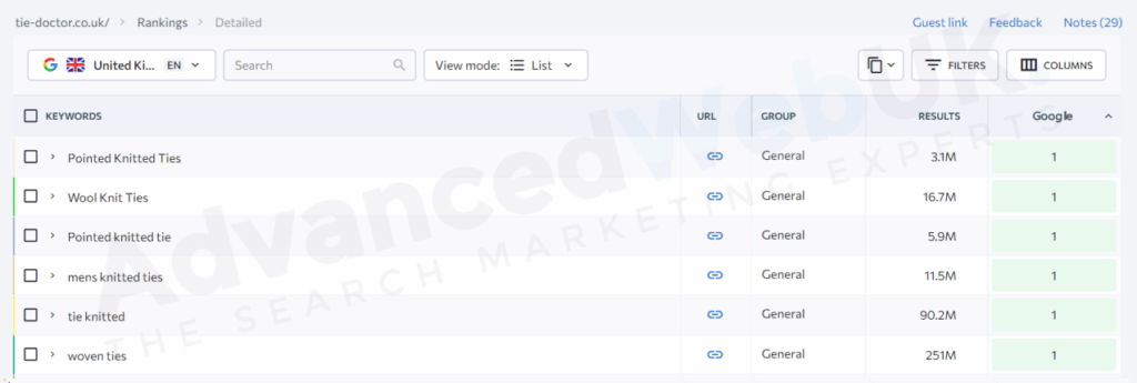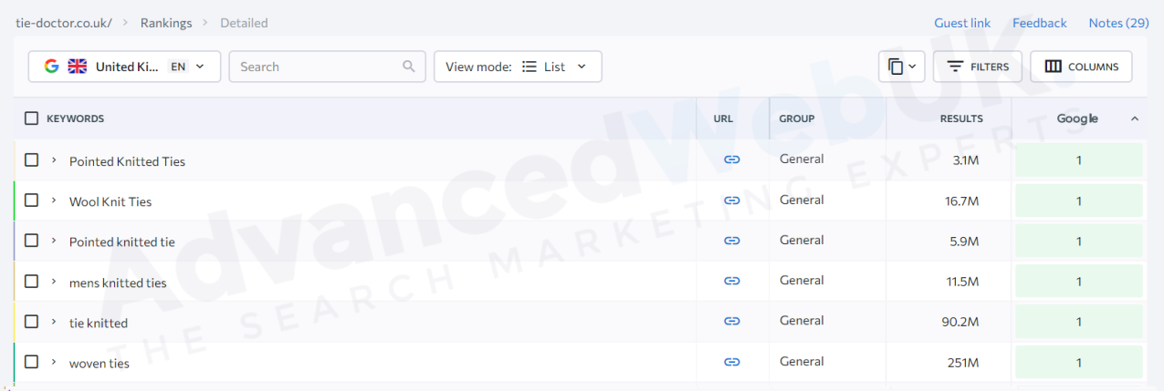 Ranked #1 out of 251 million results on Google, securing multiple top spots for competitive keywords like knitted ties and wool ties.